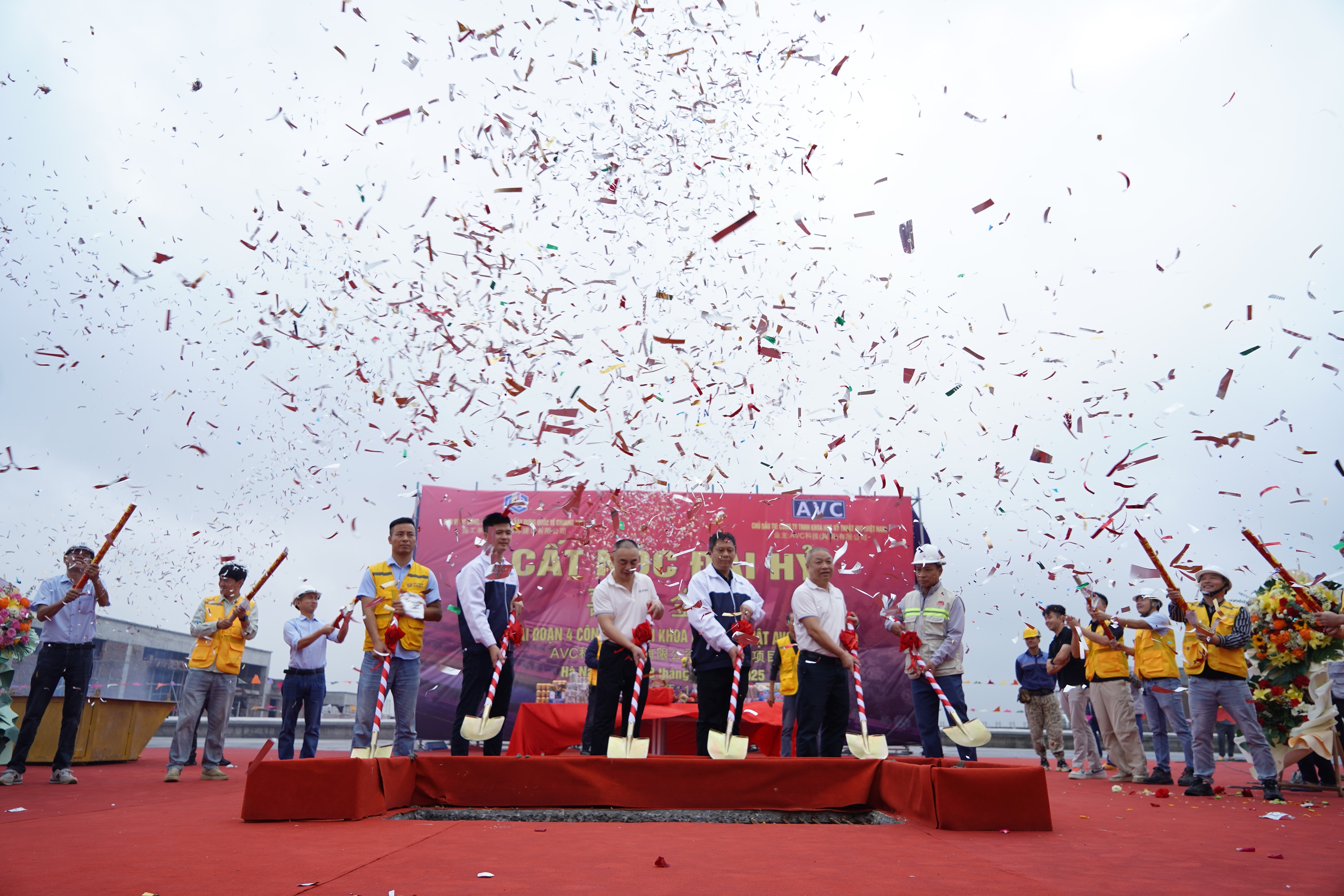 各位領導手持金鍬,伴隨著最後一方混凝土的順利澆築,現場掌聲雷動,禮炮聲響徹雲霄,AVC科技(越南)有限公司四期工程項目正式完成主體結構封頂!